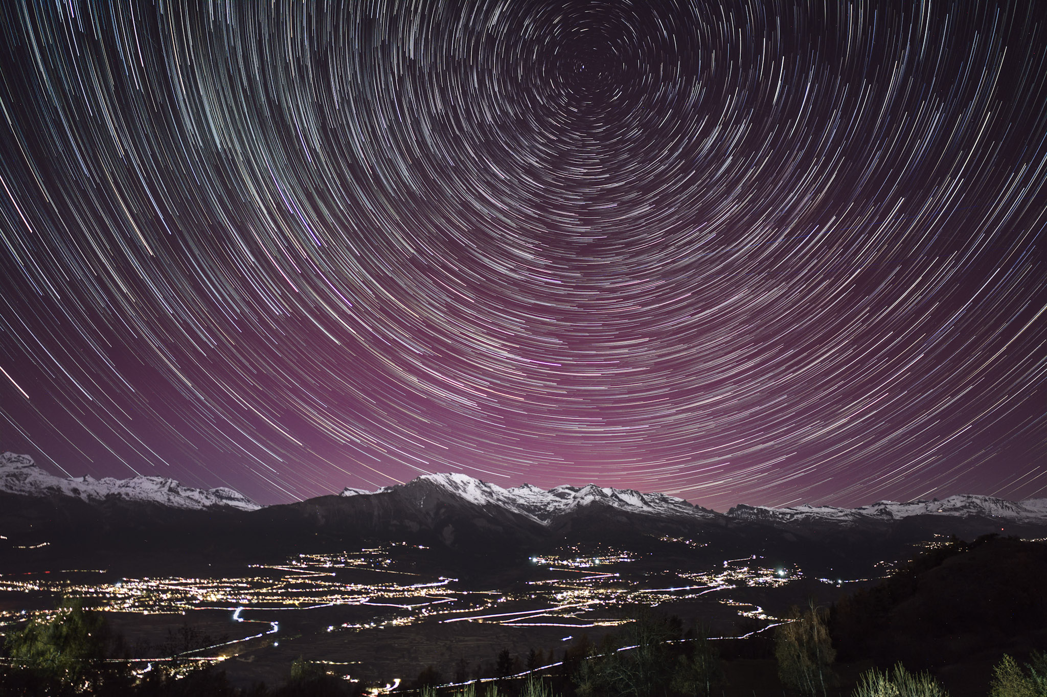Avec plus de 1600 images au final, je profite pour faire une compilation de toutes les images. Cette synthèse montre la rotation de la Terre avec l’étoile polaire au centre qui ne bouge presque pas. On voit aussi les lueurs rosées dues à l’aurore.