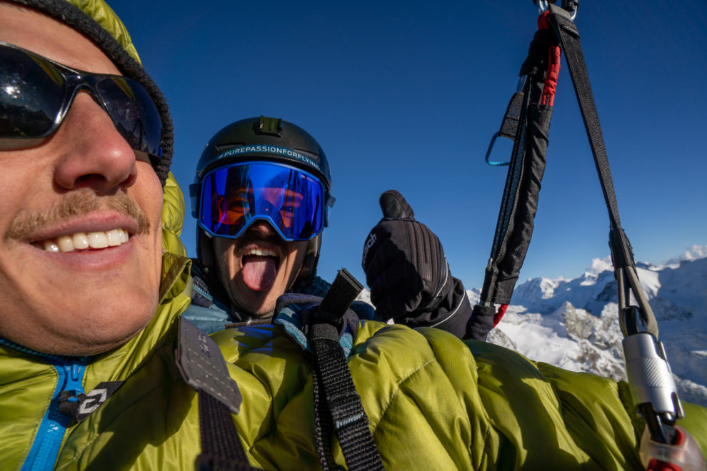 Nous ne perdons pas de temps et reprenons les cabines pour enchainer avec un second vol. Les conditions restent très calmes. Plus à l'aise, cette fois, je sors l’appareil photo pour prendre quelques images en vol. Nous décollons après Diego et Lisa, entourés par le reste de l’équipe des Cracoucasses (Marie, Linsey, Lucas et Loïc, qui nous a déjà rejoint à pied). Un vol tranquille, semblable au premier.Nous suivons l’autre biplace, parfaitement aligné avec le Zinalrothorn, de quoi prendre une belle image souvenir du vol !Diego et Lisa en biplace allant en direction du Zinalrothorn avec Loïc plus loin en plein virage. A droite le Besso reconnaissable avec ces deux pointes