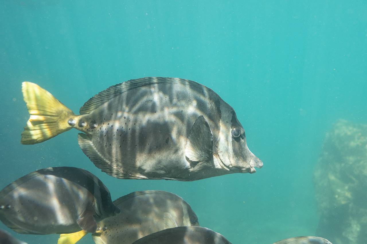 Lisa, bien plus à l’aise dans l’eau que moi, me montre de temps en temps où se trouvent les bancs de poissons colorés.