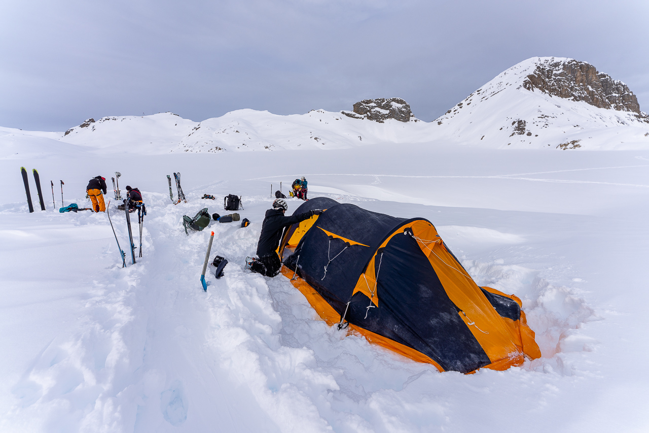 D’ailleurs, c’est une toute nouvelle tente d’expédition 4 saisons que Stéphane veut tester avant de la prendre en expédition pour une traversée de l’Islande E-W en autonomie, tiré par les vents avec son kite. Il nous a fallu terrasser un peu le terrain pour aplanir l’emplacement de la tente et creuser une tranchée dans l’abside pour avoir de la place pour les pieds et s’asseoir confortablement. Une fois la tente installée, on stocke tous nos sacs avec les affaires non nécessaires pour l’exploration puis on s’attaque au puits.