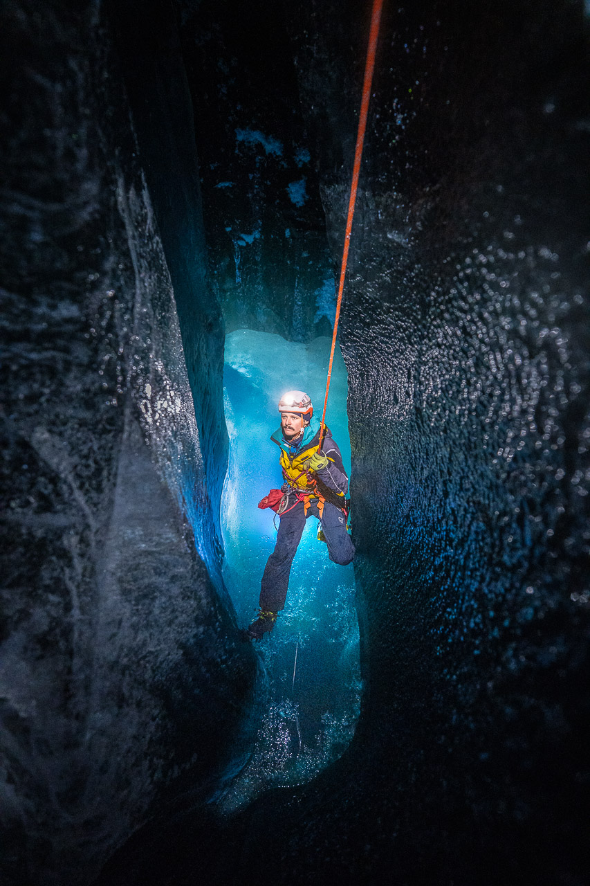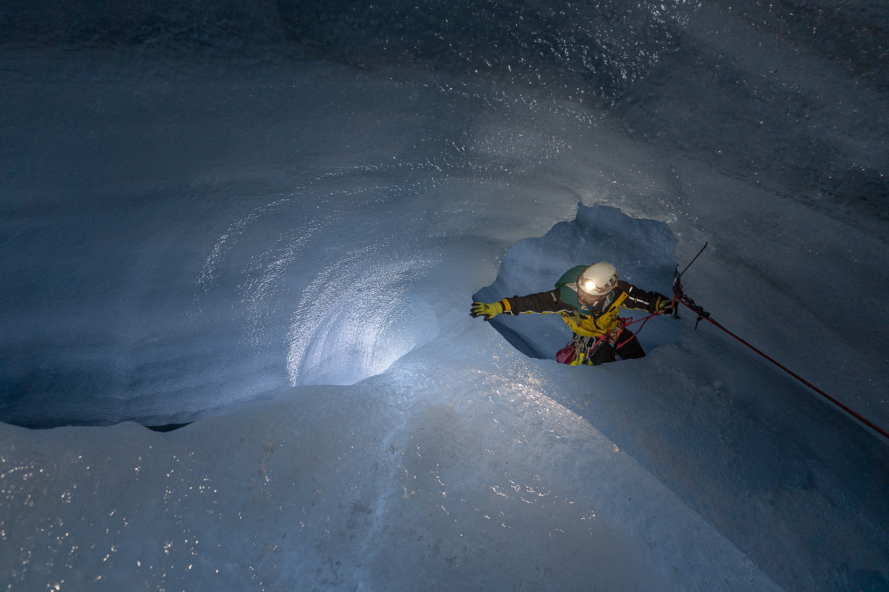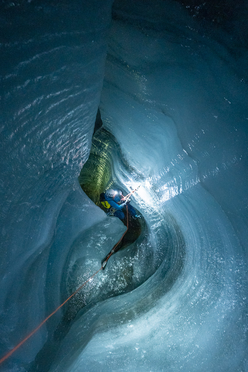 Puis, au bout du méandre, l’eau replonge pour s’enfoncer encore plus dans le glacier. L’eau liquide étant plus légère que l’eau glacée, elle cherche à se frayer un chemin jusqu’au socle rocheux du glacier. Cependant, de par l’écoulement du glacier, celui-ci se déforme et a tendance à reboucher les chemins creusés par l’eau. Un équilibre se crée entre l’eau qui sculpte la glace et le glacier qui s’autoguérit. Nous, avec nos cordes et crampons, on découvre le résultat de cet équilibre, de ce magnifique hasard naturel.