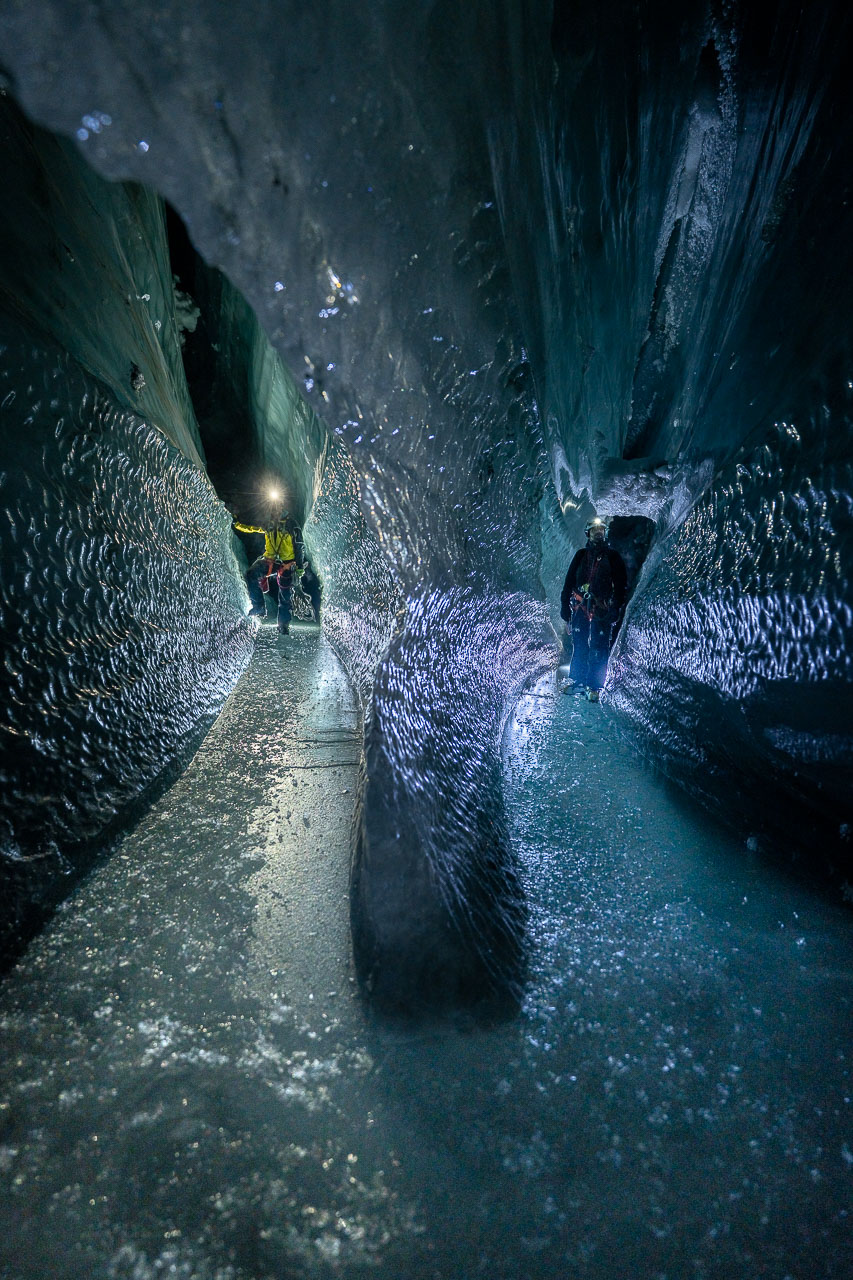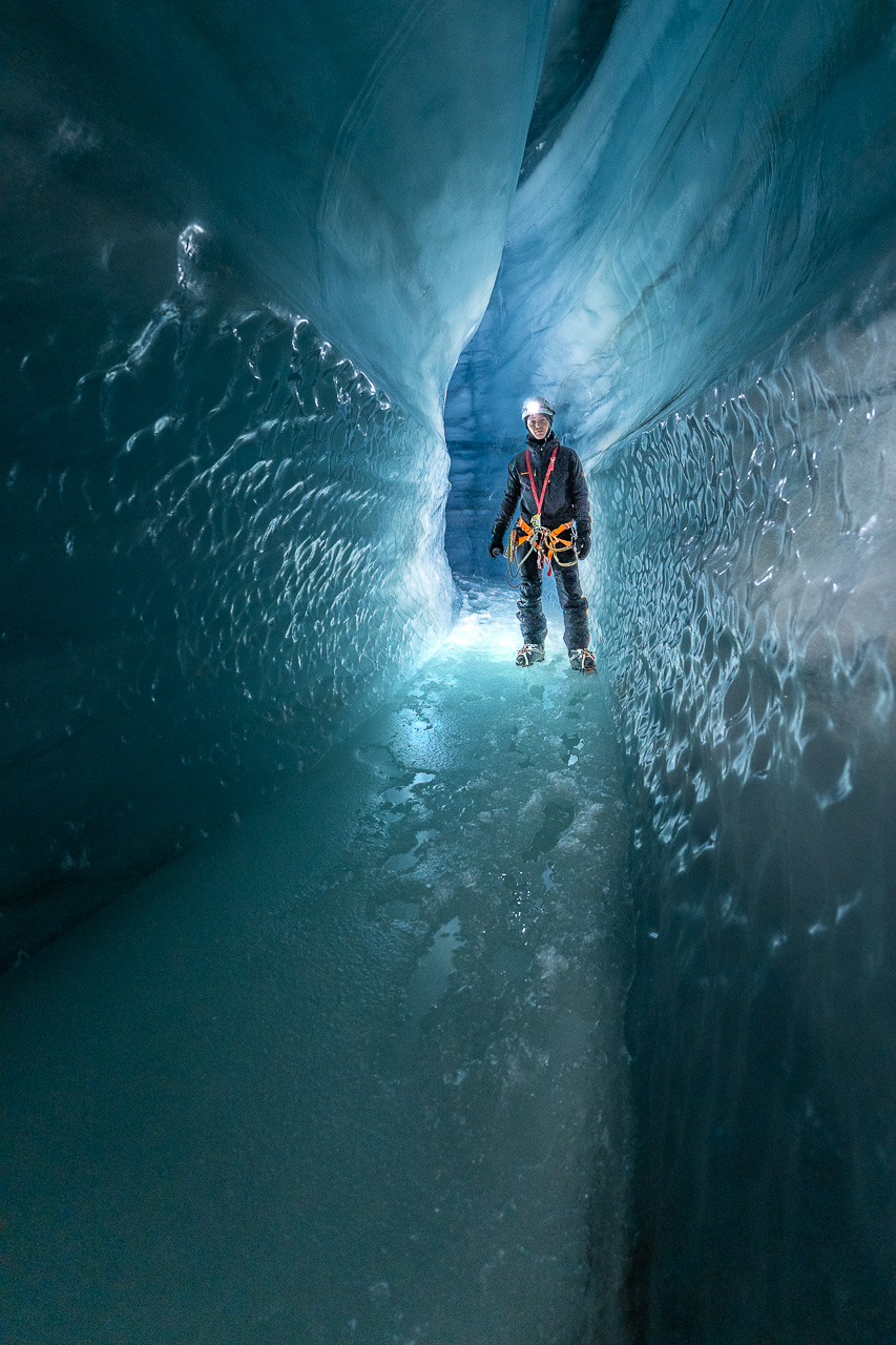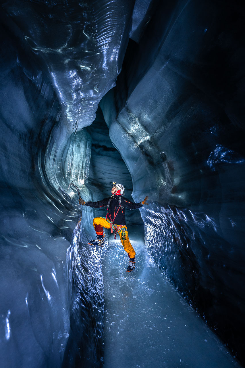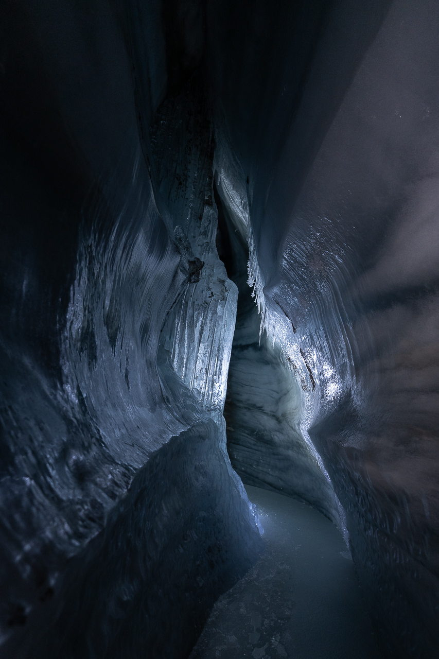 Il n’est vraiment pas facile de faire des images esthétiques de l’intérieur du glacier sans humain pour donner une échelle ou un point d’accroche familier dans l’image. Je tente tout de même quelques images avec le méandre justement, qui rencontre une cascade figée dans le temps.