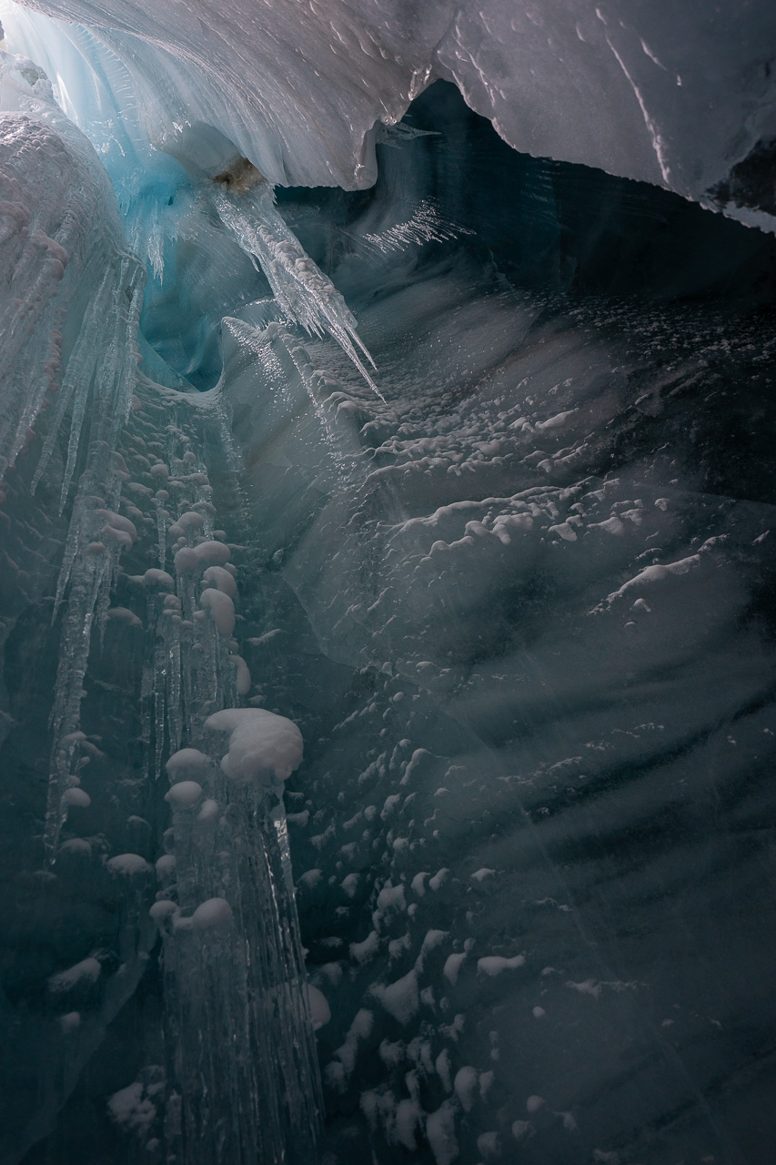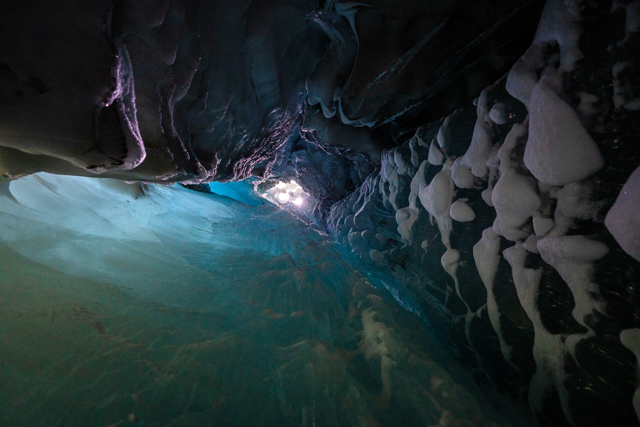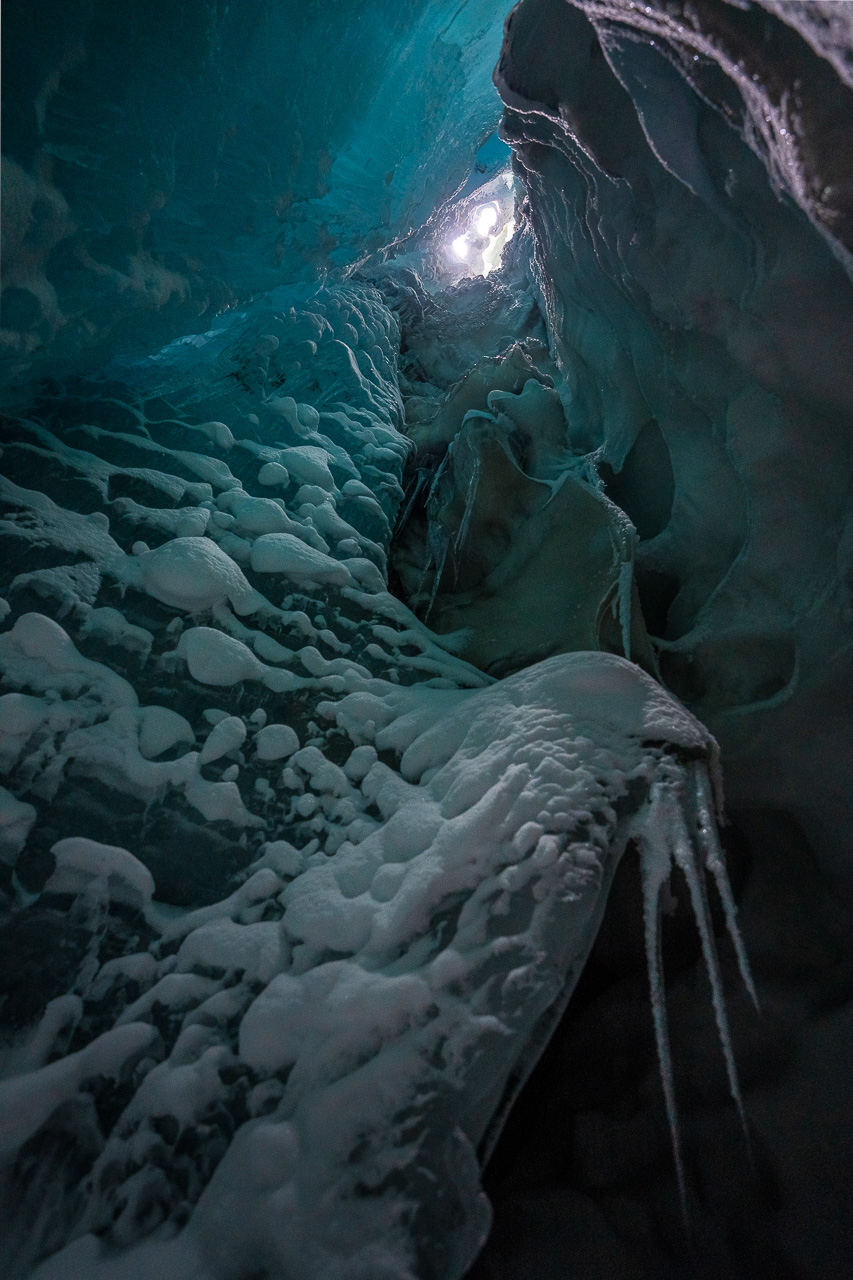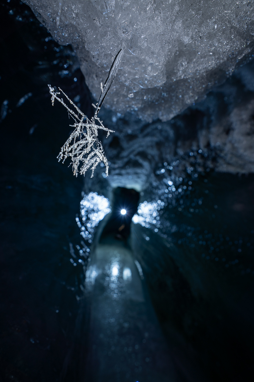 Après le premier puits, un méandre sinueux se profile à l’horizontal. On marche sur l’eau de fonte au sol, qui est partiellement gelée. Benjamin compare la texture à de la glace pilée que l’on trouve dans un mojito. On fait bien attention à mettre nos crampons sur les bords pour éviter une mauvaise surprise qui nous rendrait trempés de la tête aux pieds (le pire cauchemar dans cet environnement glacial isolé). La teinte de la glace est d’un bleu profond. Éclairées à l’aide de nos lampes frontales, les cupules dans la glace ressortent bien, pleines de facettes.