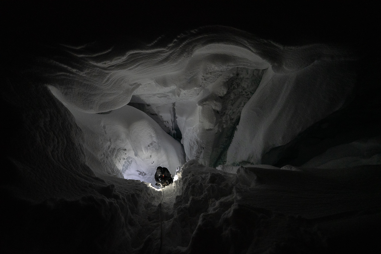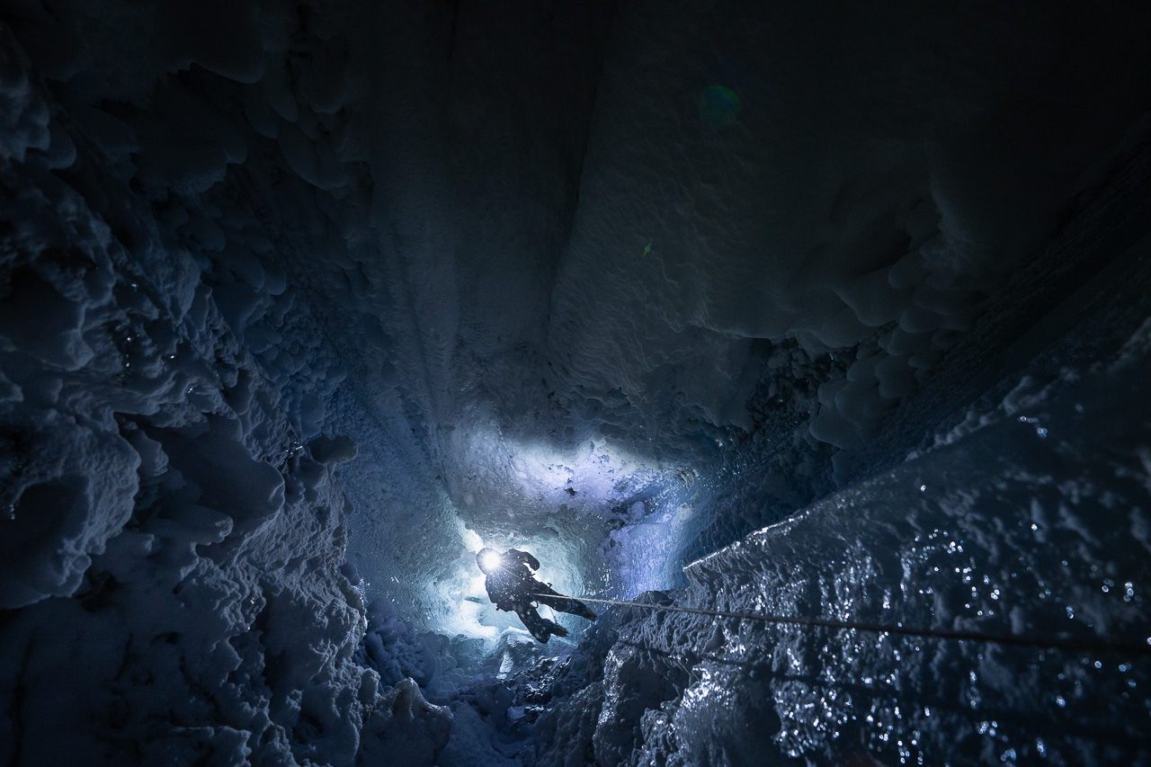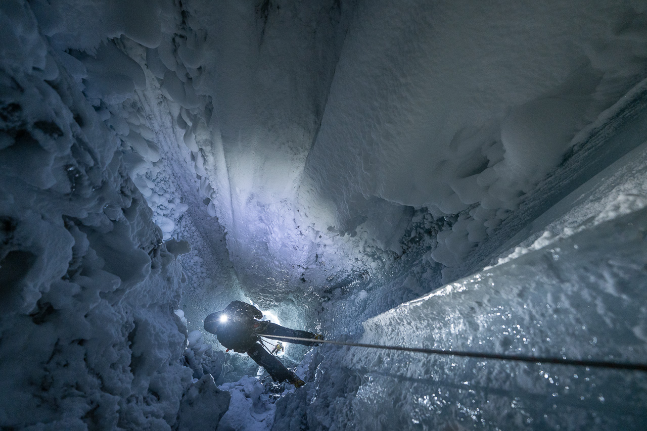 Une paire de skis est utilisée comme ancrage dans la neige. Une corde est fixée aux skis enfouis sous la neige et permet de servir de point fixe pour descendre dans les entrailles du glacier. Des broches à glace sont installées à des points stratégiques par Benjamin pour permettre une descente la plus agréable possible, si l’on peut parler de confort dans ces conditions…