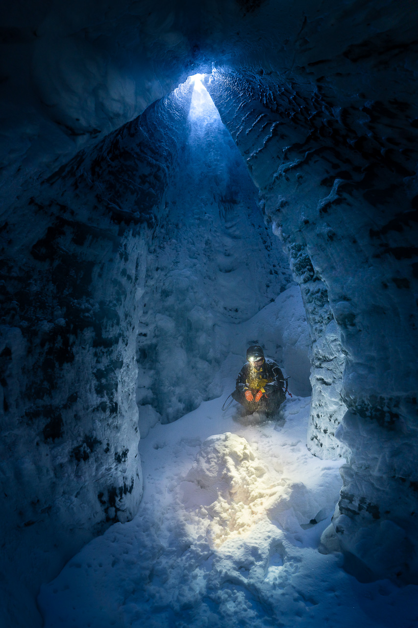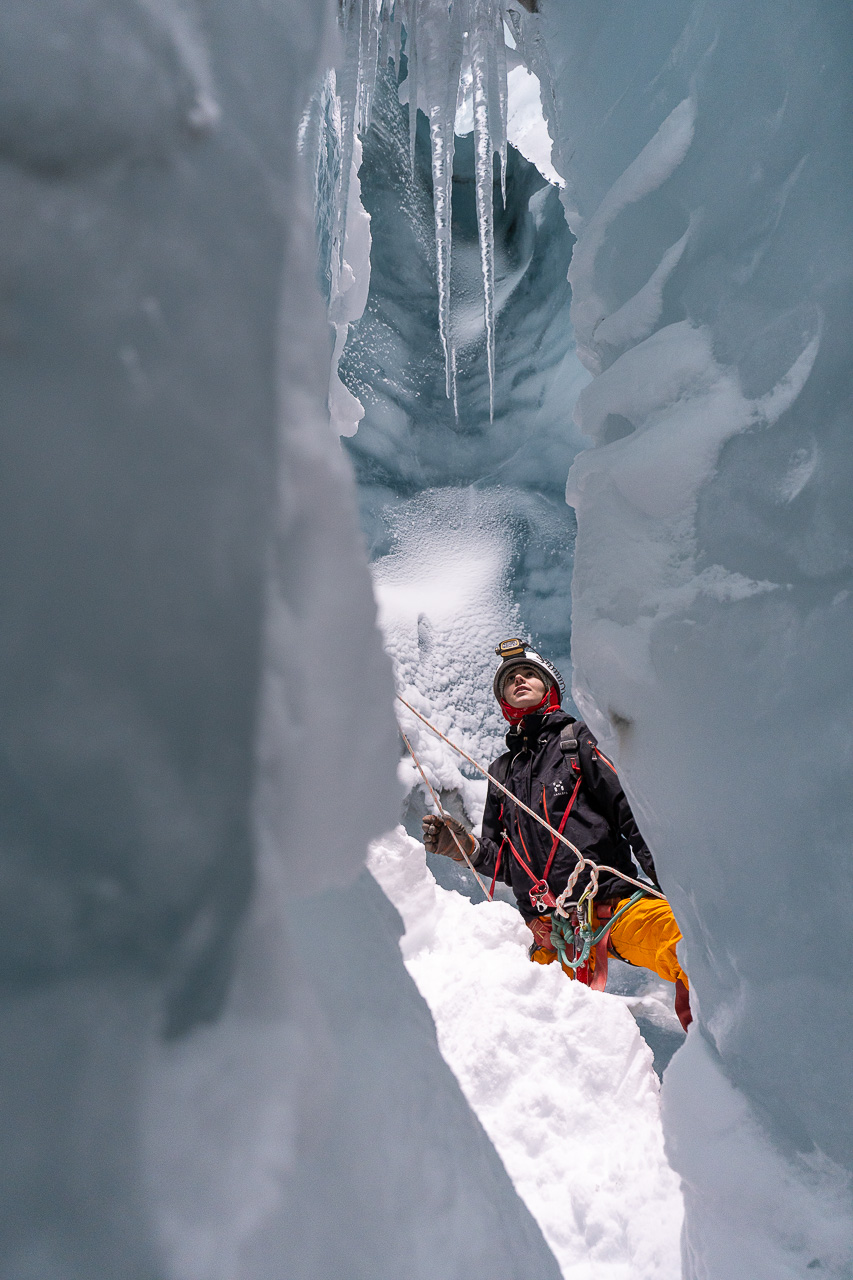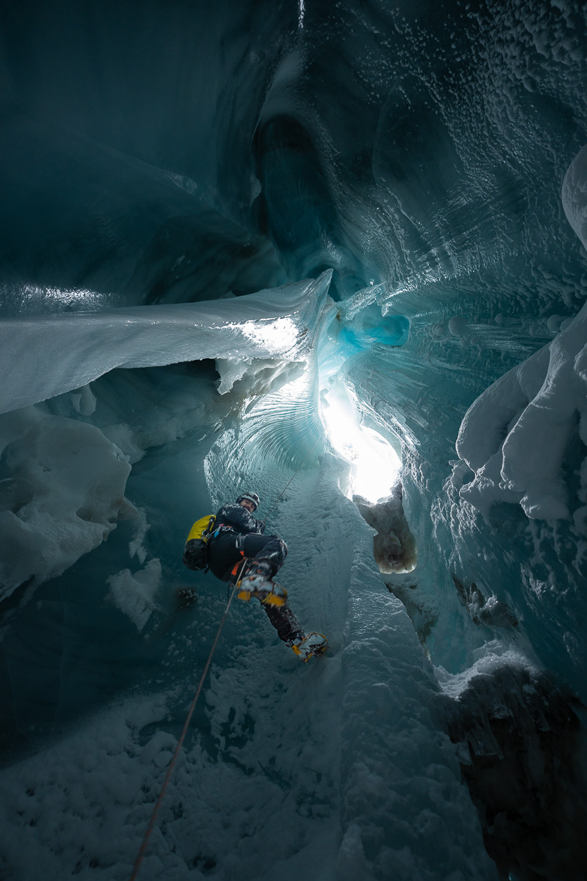Une paire de skis est utilisée comme ancrage dans la neige. Une corde est fixée aux skis enfouis sous la neige et permet de servir de point fixe pour descendre dans les entrailles du glacier. Des broches à glace sont installées à des points stratégiques par Benjamin pour permettre une descente la plus agréable possible, si l’on peut parler de confort dans ces conditions…