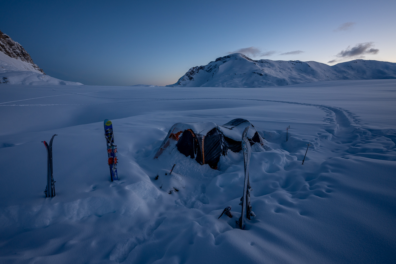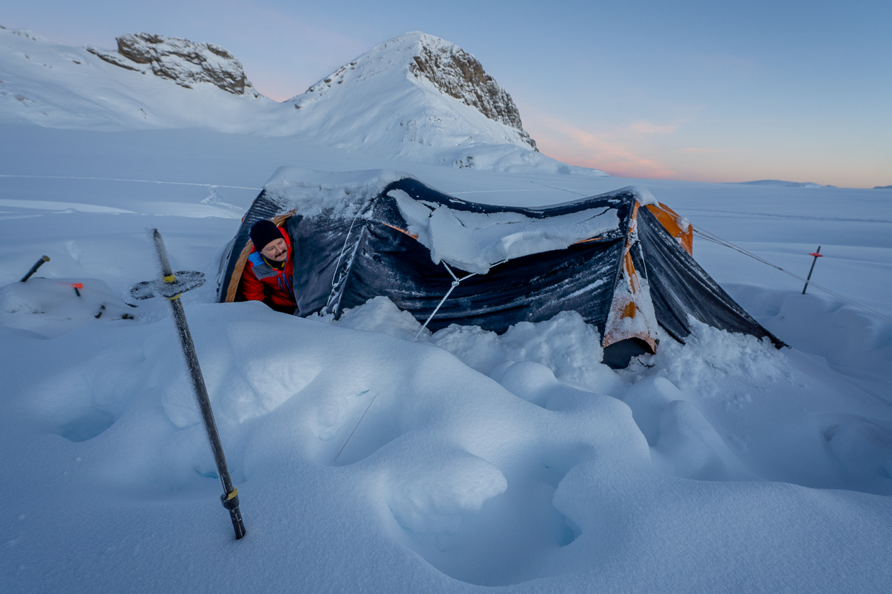 Une fois rassasiés, on se glisse dans nos sacs de couchage et l’on essaie de trouver le sommeil. Pendant toute la première partie de la nuit, on entend le crissement de la neige tomber sur la toile de la tente puis, en seconde partie de nuit, plus rien. Le froid se fait aussi plus mordant, un signe que le ciel s’est dégagé !