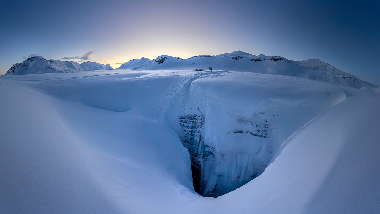 Le froid a figé des stalactites transformant le glacier en œuvre d’art. Joanna observe la sculpture avant de disparaître elle aussi dans les entrailles du glacier, là où la lumière ne pénètre plus.