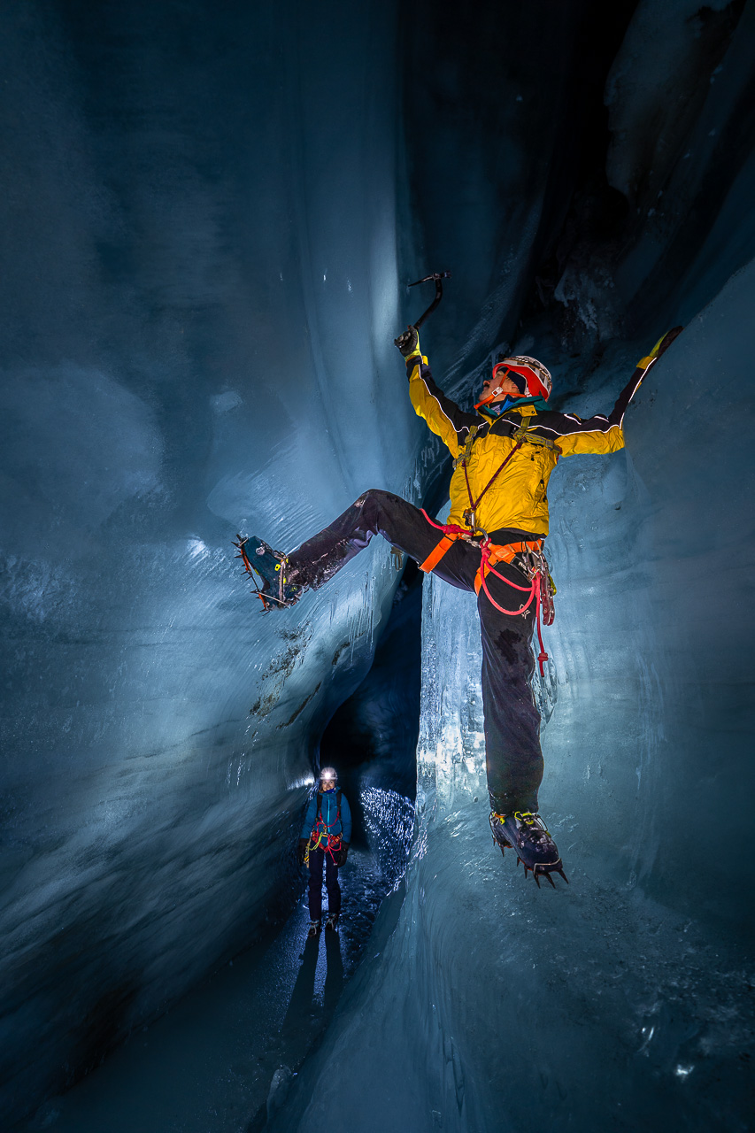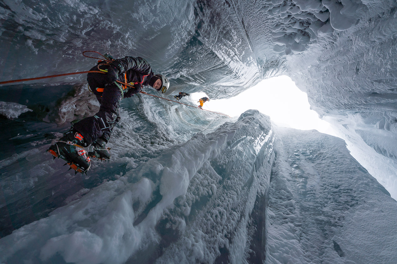 Il faut s’imaginer ici que l’été, lors de la fonte du glacier, tout le méandre est rempli d’eau et que des centaines de litres par seconde s’écoulent dans ces bouillonnements. À l’aide d’un piolet technique pour la glace, on tente d’accéder à la partie supérieure du méandre.